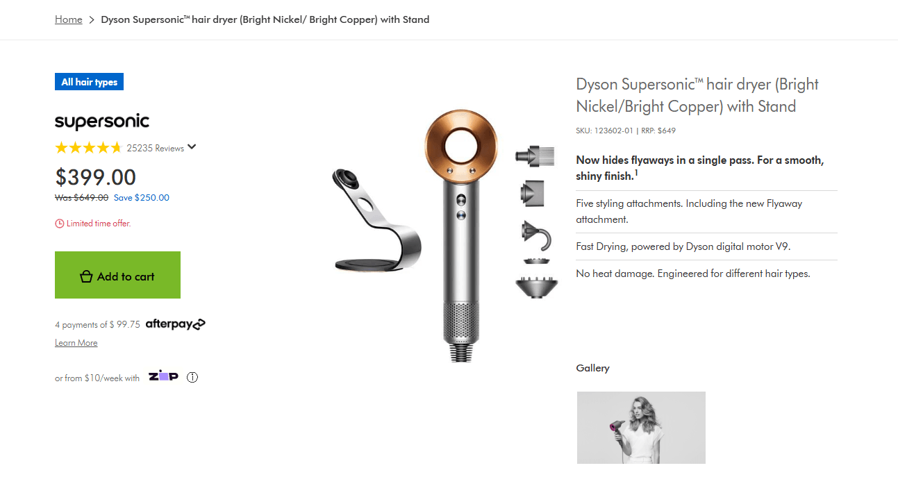 Dyson Supersonic hair dryer is on sale at Dyson for a limited time, normally $649, now $399, with free shipping. Comes with 6 attachments (including a stand). Not a bad price considering the Supersonic Origin which only comes with one attachment retails for $499.