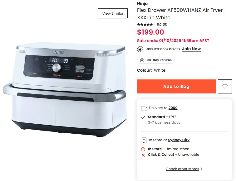 The big Ninja XXXL Air Fryer (I think this is probably the biggest one) 10.4L Air Fryer is down to $199 at Myer. The RRP is $349. Stock looks limited, but still can find some.
