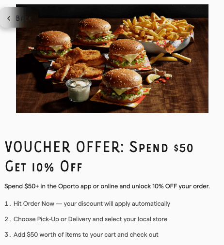 Saw this on OzBargain, spend $50 get 10% off at Oporto. All you need to do is order in the app or online, and the discount will automatically apply. This works for both pick up and delivery orders.