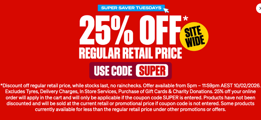 Find out how →Get 25% off regular retail price sitewide with coupon code SUPER. This excludes tyres, delivery charges, in store services, purchase of gift cards and charity donations.