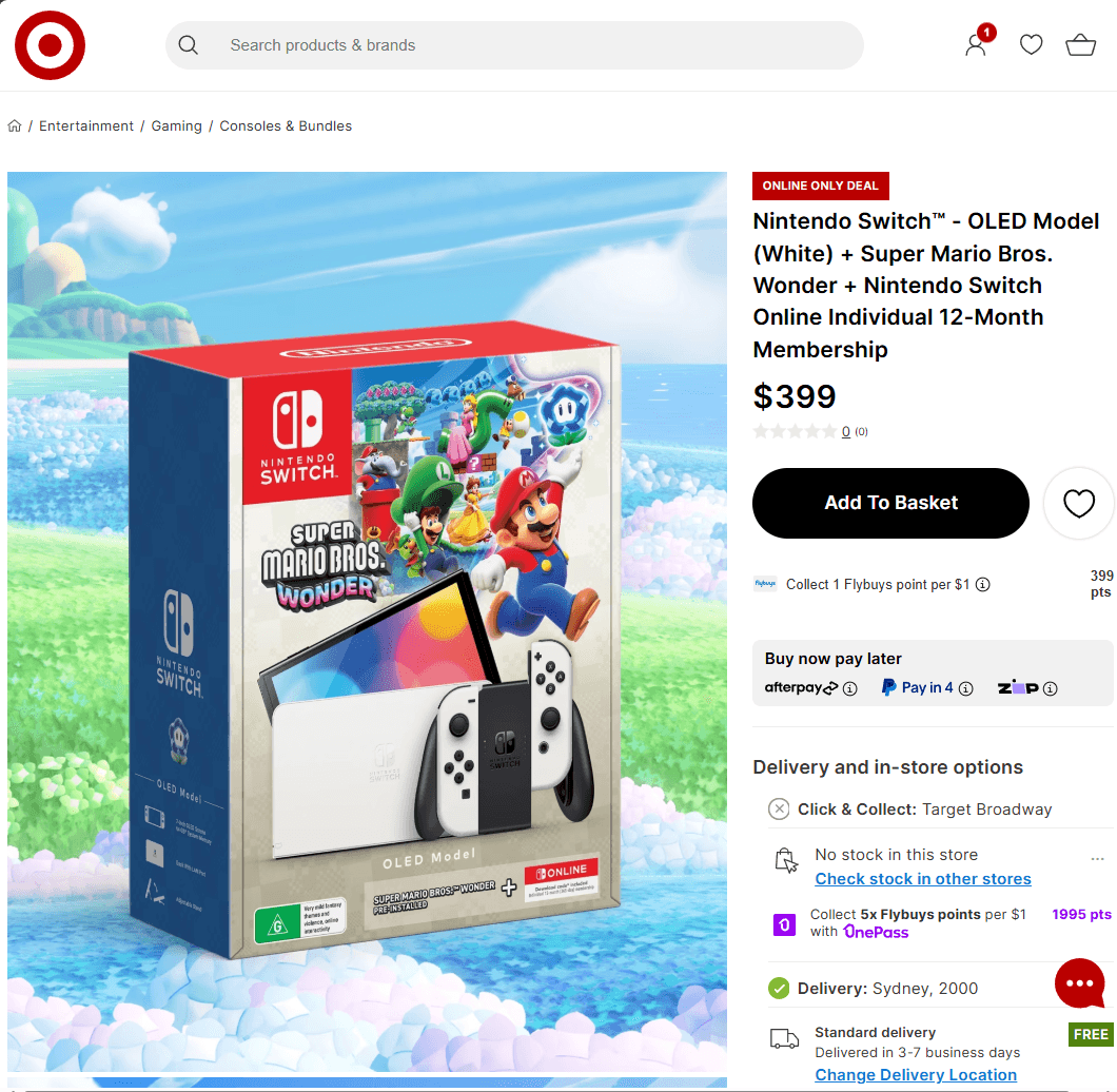 Great price for the Nintendo Switch OLED with Super Mario Bros. Wonder at Target. Stocks are limited at certain stores but available for free standard delivery.