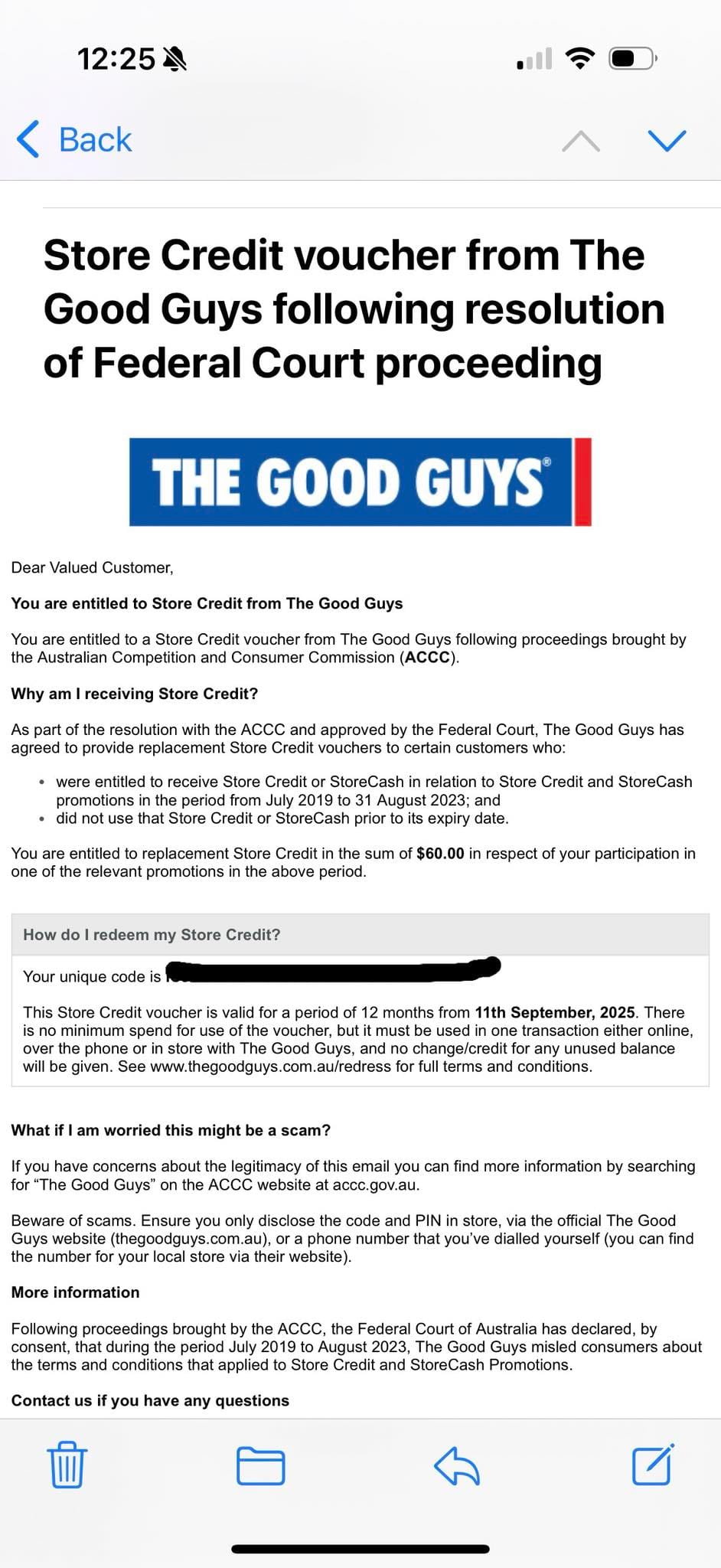 Not a markdown but if you have bought from The Good Guys check your emails. I thought this was a scam but decided to jump on The Good Guys add something to my basket then proceed as if I’m checking out with the store credit code and pin and much to my delight it worked 🥳 So happy to get this considering I had no clue about the Federal Court Proceedings 🙈